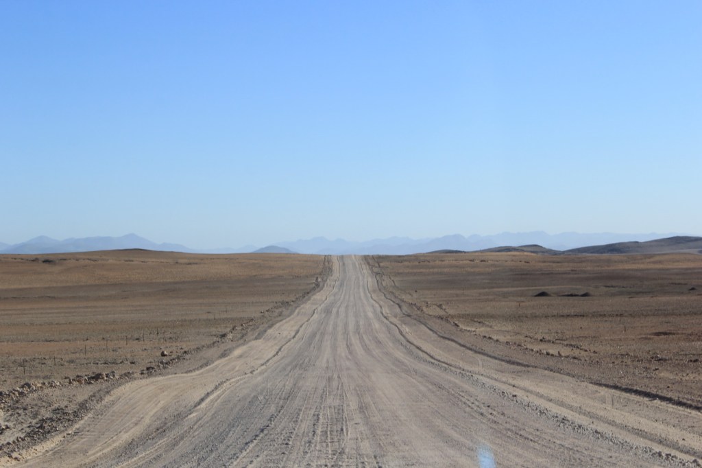 We wanted to see something of Namibia’s skeleton coast so instead of heading straight inland we spent a novelty couple of hours on a tar sealed road. Long and straight it had a sea haze and the fog warnings it had were easy to imagine are a regular occurrence. We were stoked to come across one of the coast’s infamous ship wrecks as we thought they were all higher up the coastline(the rough seas caused by strong wind and currents are primarily to blame).
