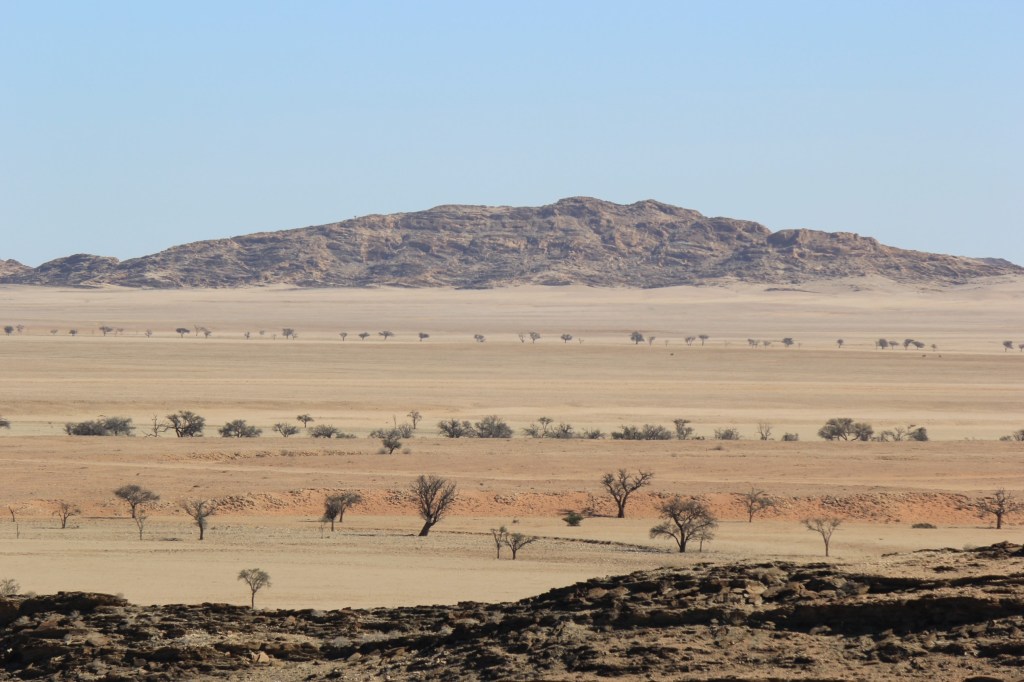 The vast expanse of moon-like desert changed as we entered the northern part of Namib-Naukluft National Park, it turned hilly, but not raised hills, the only way to describe it was that it was like small hills with valleys. They were almost as far as the eye could see. Not sure we’ve seen anything quite like it. Then it opened up into big African savannah. We saw a few zebra and springboks but mainly kept seeing random ostriches.