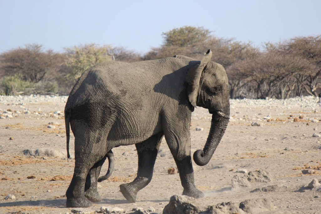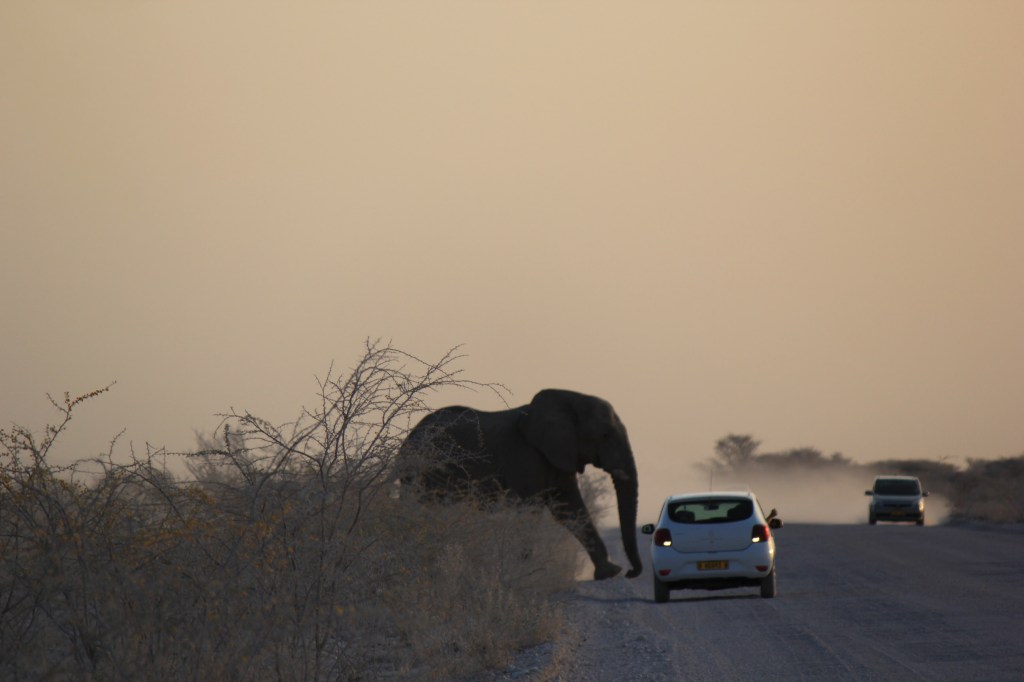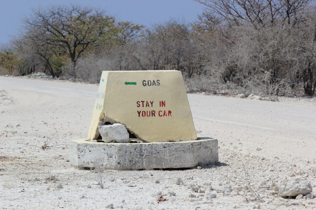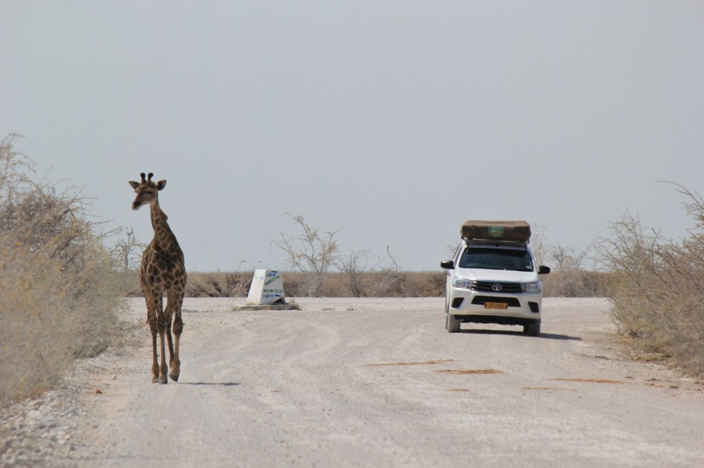 A few hours in and we stopped behind another parked 4×4 as it always makes sense to check out what others have spotted. They suddenly decided to reverse and despite Marie hitting the horn they drove into us – their rear driver’s side into our front passenger side panel. We’d left a good vehicle length gap and had parked staggered so we had been easily visible in their mirrors, they’d just got excited and hadn’t looked. We pulled alongside, 3 guys in a hire vehicle the driver was very apologetic. Luckily aside from bumper and light scrapes the damage was just to the panel so it was all cosmetic. We swapped all the details we could then carried on with our day. Our rental agreement requires us to report all accidents to the company ASAP no matter how minor so we duly did that at one of the Park campsites where we had lunch. It also required us to get a police report (it’s mandatory in Namibia to report accidents to the police within 24 hrs anyway). Failure to do either would result in us being responsible for the cost of the damage. The police usually at the camp couldn’t be found so we asked the police on the East gate we exited from that evening when we left the park. They couldn’t/wouldn’t do the report and directed us to the police station in the nearest town 20km away.