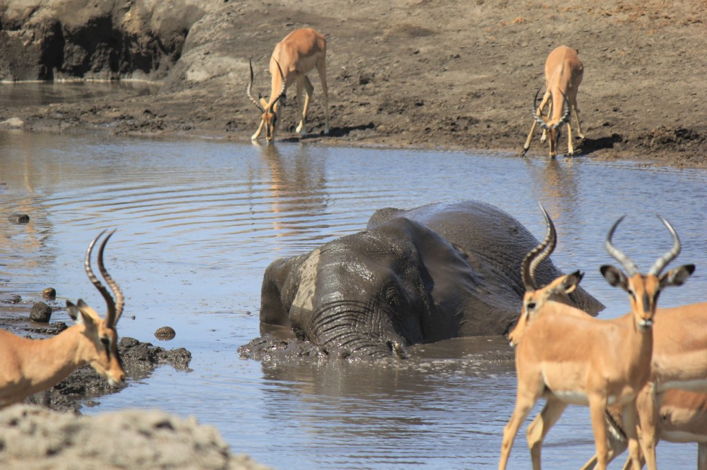 We spent the fading light of the afternoon looking at what had become almost dry watering holes but saw our first (live) giraffes, wilderbeast, couple more lions that were much further away, and finally as we were heading to leave our first elephant; a big male who got hissy at a car it stepped out in front of when it decided to cross the road. It reminded us that this is wild Africa. As did the lions that roared all through the night.