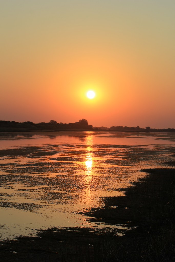 The excitement continued when we reached camp shortly before sunset. Set next to a river it had hippos. It had an electric fence to keep them out as campers used to get up in the night and find them wandering around. We walked out onto the camp’s bamboo jetty to photograph the sun setting over the river and noticed 2 eyes upstream. We watched them mesmerised as they came closer as it made its way downstream. Further up the river we could see at least a dozen more. The hippos can’t get onto the jetty but after the sun had gone the first out of eyes came closely past us. The other dozen had rapidly made their way downstream too but it had gone dark by the time they reached us. They made a hell of a racket for a few hours until they finally moved on.