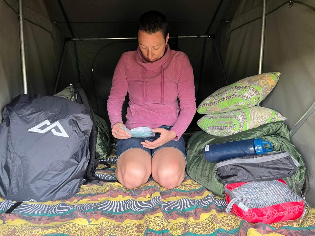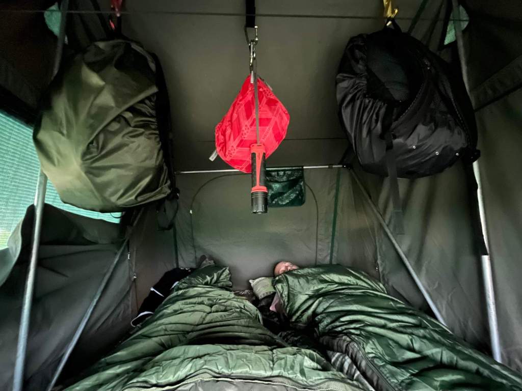 Both the roof tent and the sleeping bags the company had given us look new. The pillows are small and look cute but are as hard as a rock, we have our own pillows but by the time we discovered this we couldn’t be bothered to climb back down to get them out. They turned out to be surprisingly comfy and the zebra design matched the sheet they’d given us for the mattress.