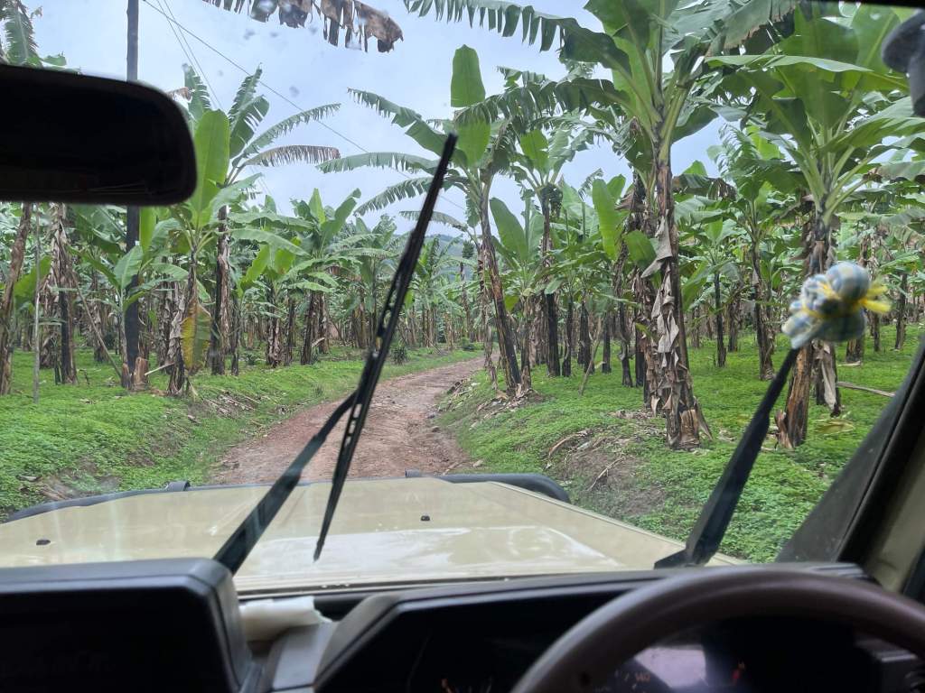 Thankfully after the first ‘squeegee’ the shower eased quite quickly so we got to the lodge turn off much quicker and easier than expected. A narrow and bumpy 4WD track led us up the hill, through banana plantations. Luckily at every junction it was signed.