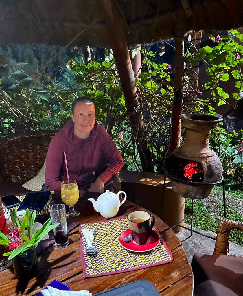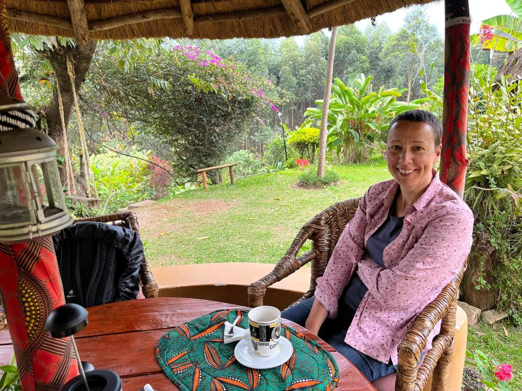 The lodge turned out to be lovely. Set in beautiful gardens there was a main lodge building and heaps of huts to sit outside. Tiered on the hillside the small campsite area was first above the lodge and then the rooms were on the tiers behind. The toilets and showers for the camp and garden were down a level, set in the trees.